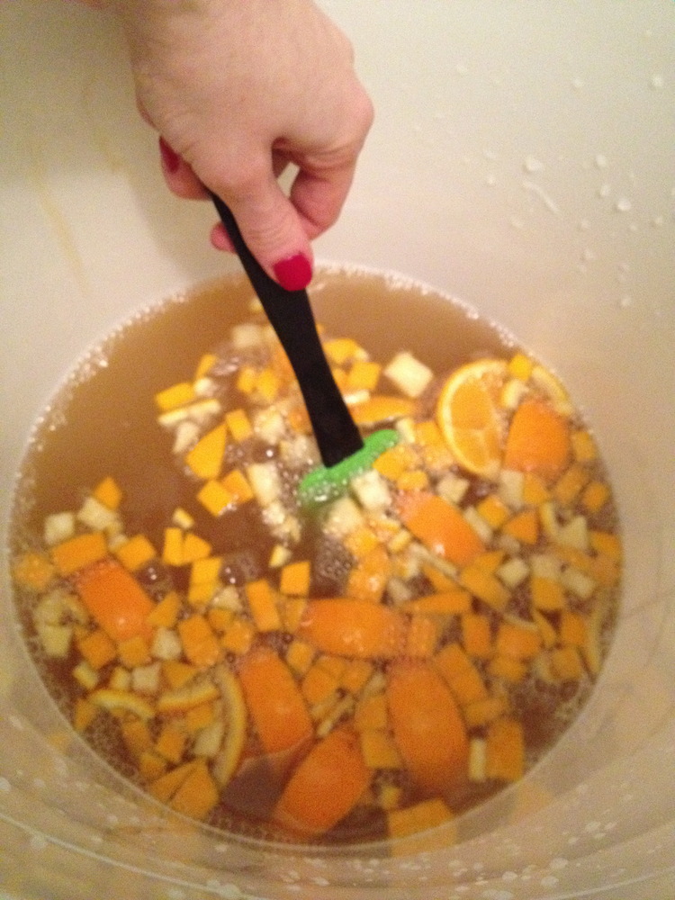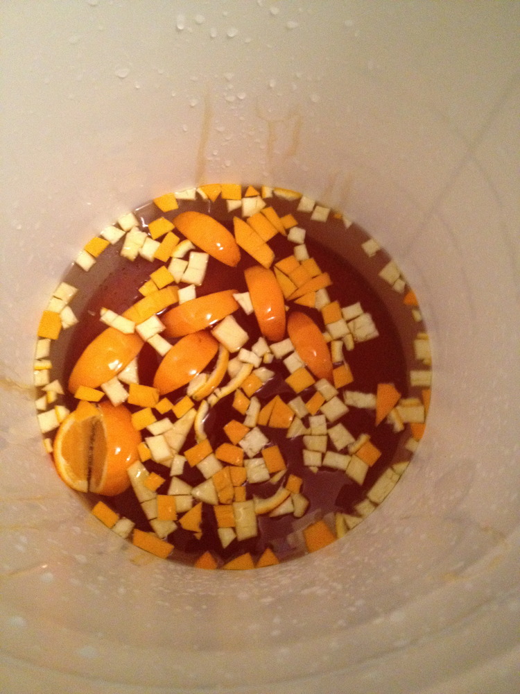 We started by mixing together about 1.5 gallons of spring water, 4.5 pounds of honey, one sliced orange, and some orange peels.