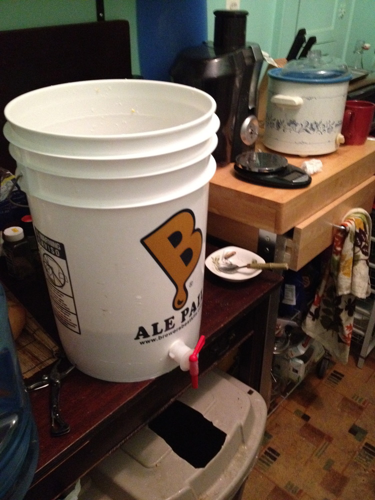 We added about 50 disgusting raisins* and then finally a half an ounce of active dry yeast that I first activated in warm water. The final amount of liquid was about 2 gallons.