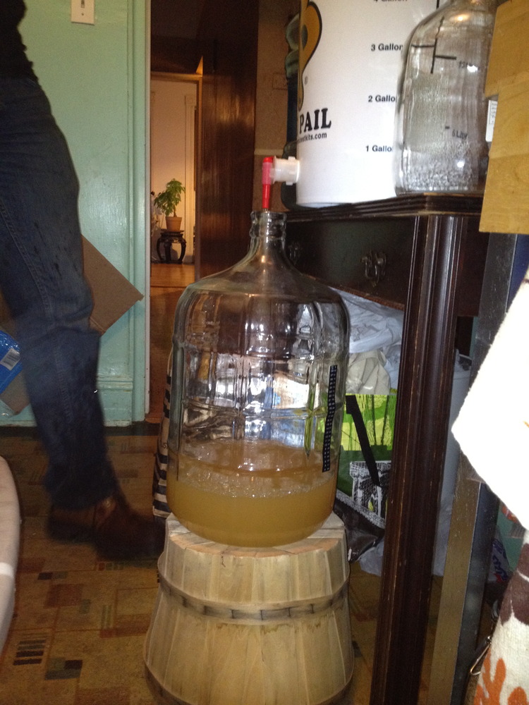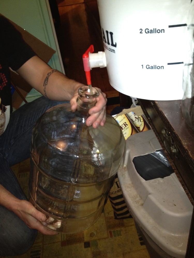 The transfer was taking so long that I could feel myself aging, so we got crafty with a nearby basket to avoid holding the carboy up the whole time.