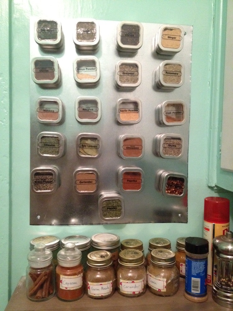Or you can just buy a magnetic spice rack. I had fun making one, but the difference in cost is negligible.